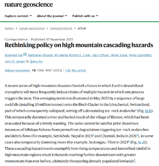 近日,实验室范宣梅教授团队在国际顶级期刊《Nature Geoscience》(自然・地球科学)发表题为《Rethinking policy on high mountain cascading hazards》的通讯文章。